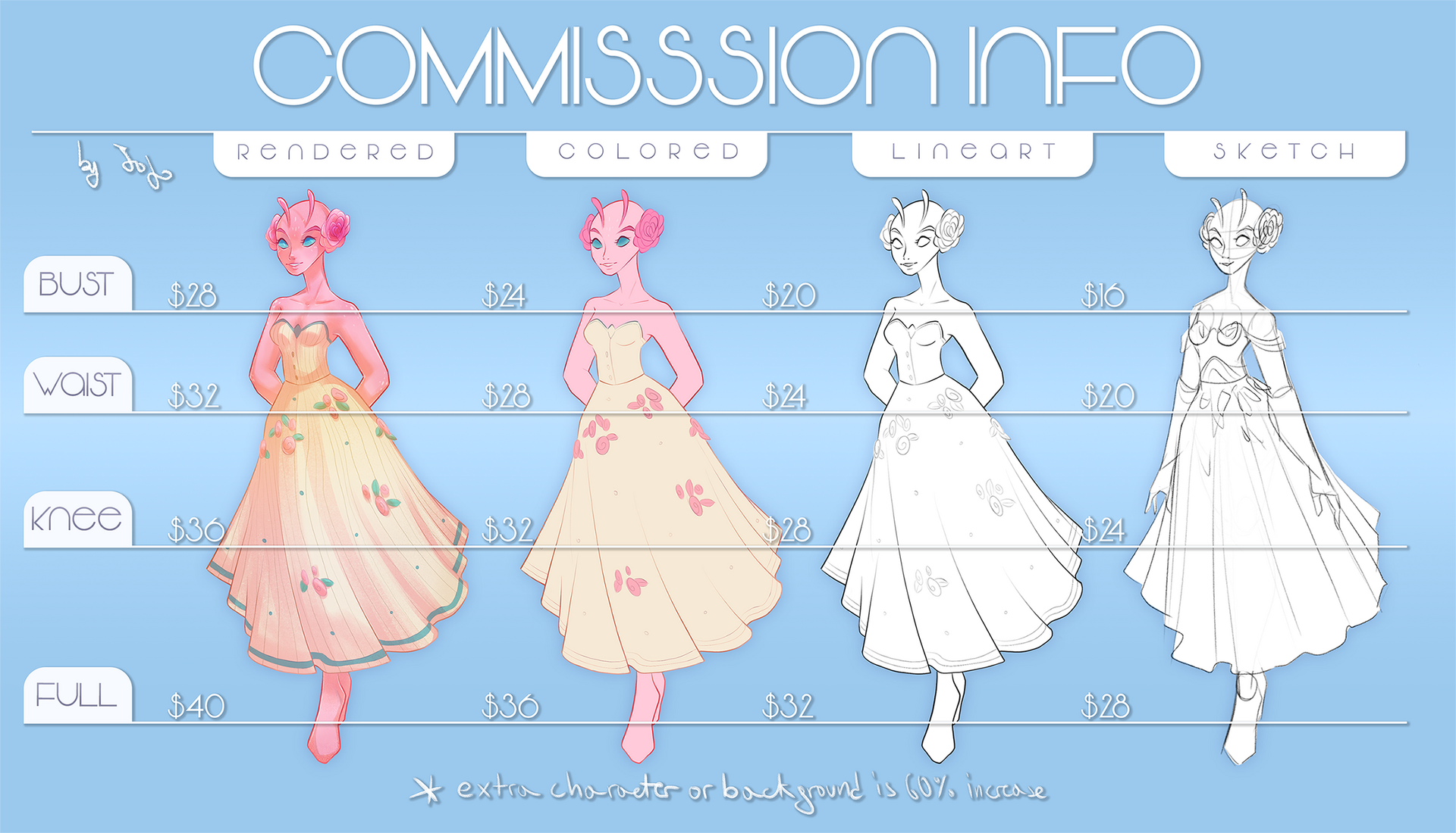 Email or DM me on any social media to place an order. Do let me know in advance if there is a deadlineI maintain the right to decline any commission for any reasonIf you wish to print the final piece, specify a size and resolution (no fee for that)Payment is done upon placing the commission and done via Paypal only. No refunds once I begin workingVisual references of characters, poses (& possibly setting) are highly recommendedYou can request WIPs if you likePlease do not ask to remove my watermark & signatureDepending on how complicated the request is, the commission can take up to 1-3 weeks (please do know I have work & school)I maintain the right to post my artwork on my social media & websites first, then you can repost or personally use the commission as you like, except for commercial use, as long as you credit me